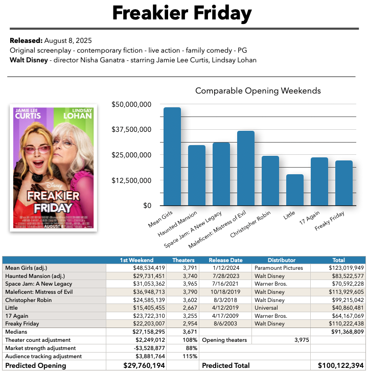Historically, comedies have had Thursday-to-weekend multipliers around 10, which puts Friday on pace for a $30-million debut. Haunted Mansion is a counterpoint to that optimism. It had the exact same performance from previews ($3.1 million), and opened with $24.1 million, but far worse reviews and audience scores. $25 million looks like the minimum for Freakier Friday right now, based on that comparison, which again would be a good result in itself.