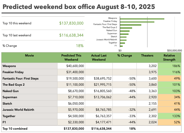 The standout comparison here is Sinners, which turned $4.7 million in previews into a $48-million opening back in April. Weapons is getting reviews that are similarly enthusiastic. Could that turn into a runaway performance in theaters? The model takes a conservative view right now, but hitting $40 million on opening weekend would be spectacular nonetheless.